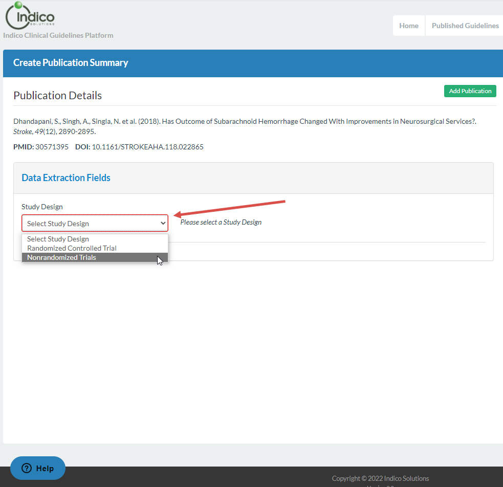 After you have selected a study summary you need to select a study design from the drop-down options. Choose the one that most closely describes the publication study design that you are extracting data from.