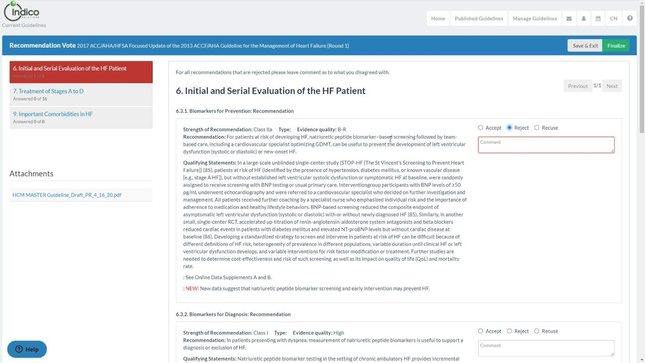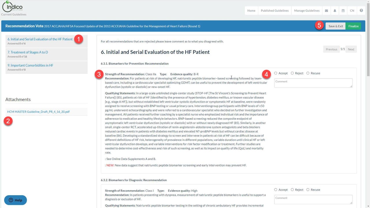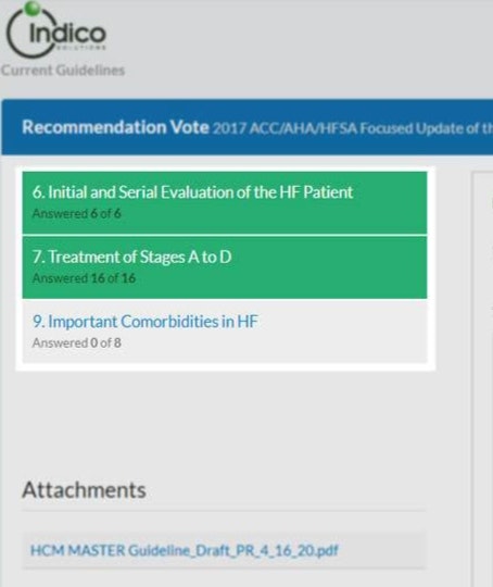 - Here is a list of the sections that have recommendations that require voting. You will also see a count of the total number of recommendations and the number of completed votes.