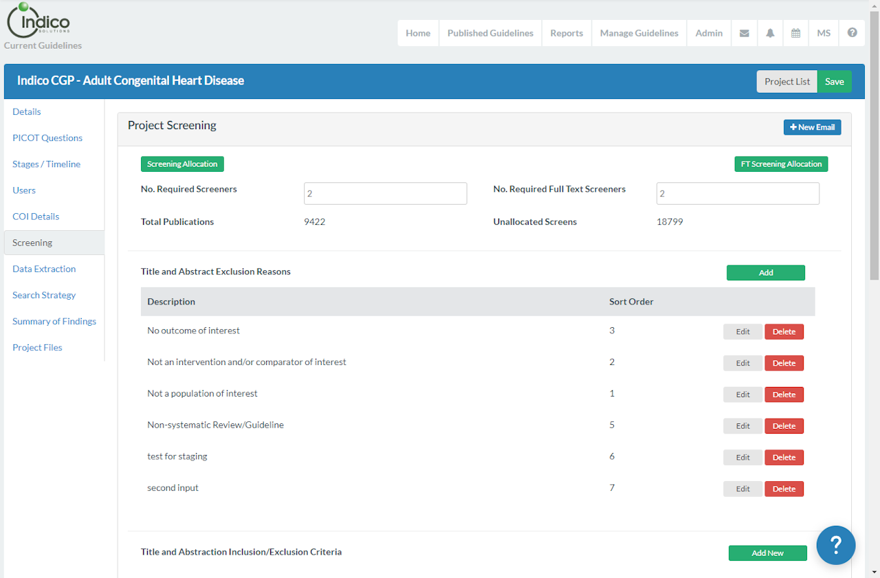 The Indico CGP can manage screening by one or more reviewers. Prior to the commencement of screening Project Managers need to create relevant Title and Abstract Inclusion / Exclusion criteria and screen "Exclusion Reasons".